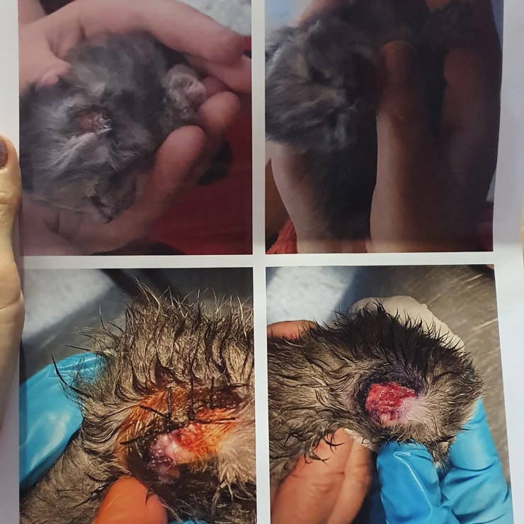 "В клинику был доставлен котенок возраста, предположительно 10 дней, с обширным повреждением мягких тканей головы и частичной травмой костей черепа. Отрезаны обе ушные раковины, предположительно, ножом. Состояние средней тяжести. Проведена операция", - сказано в справке ветклиники.