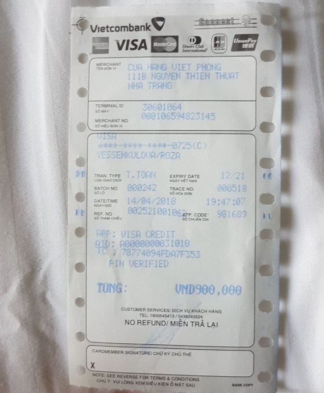 Через четыре дня в номере в отеле перед отъездом журналист обнаружила, что ее карточка заблокирована из-за огромного "минуса" на счете. "Я решила закрыть счет за мини-бар, так как возвращалась обратно в Казахстан. Но не смогла заплатить из-за заблокированной карты. Пошла в банкомат - нет доступа к деньгам. Решила посмотреть в хоумбанке, что происходит, и у меня чуть не случился инфаркт - я ушла в минус на 1,3 миллиона тенге! Эта сумма в блоке. Магазин показал чеки и выписку с терминала, все верно - 900 тысяч донгов. Но вдруг банк снимает с меня такую огромную сумму и закрывает мне доступ к карте", - поделилась алматинка.
