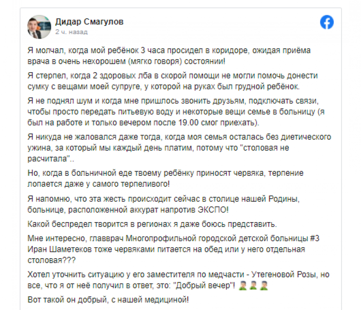 Но, когда в больничной еде твоему ребенку приносят червяка, терпение лопается даже у самого терпеливого! Я напомню, что эта жесть происходит сейчас в столице нашей Родины, больнице, расположенной аккурат напротив ЭКСПО", - написал Смагулов (орфография и пунктуация здесь и далее сохранены).