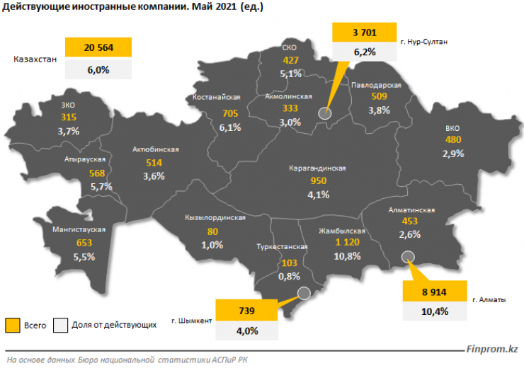 Две трети иностранных компаний в стране расположились в трех регионах. Наибольшее их количество работает в Алматы - 8,9 тысячи компаний, которые составляют 10,4 процента от всех предприятий в городе. На втором месте расположилась столица - 3,7 тысячи иностранных компаний (6,2 процента от общего числа). По концентрации иностранных предприятий в лидеры вышла Жамбылская область - 1,1 тысячи, или 10,8 процента от всех предприятий региона.