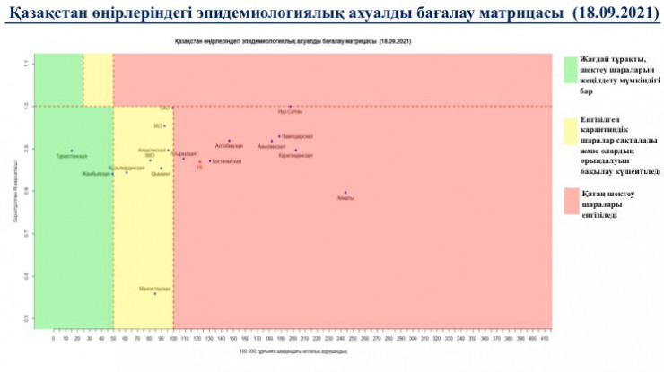 Согласно матрице оценки эпидемиологической ситуации в регионах Казахстана на 18 сентября 2021 года: