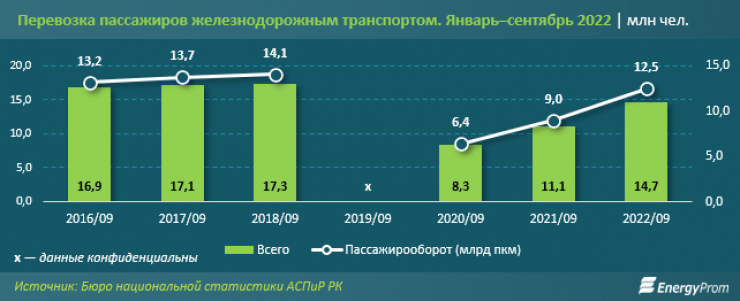 Всего железнодорожным транспортом с начала года по сентябрь было перевезено 14,7 миллиона пассажиров, на 32,6 процента больше, чем годом ранее.