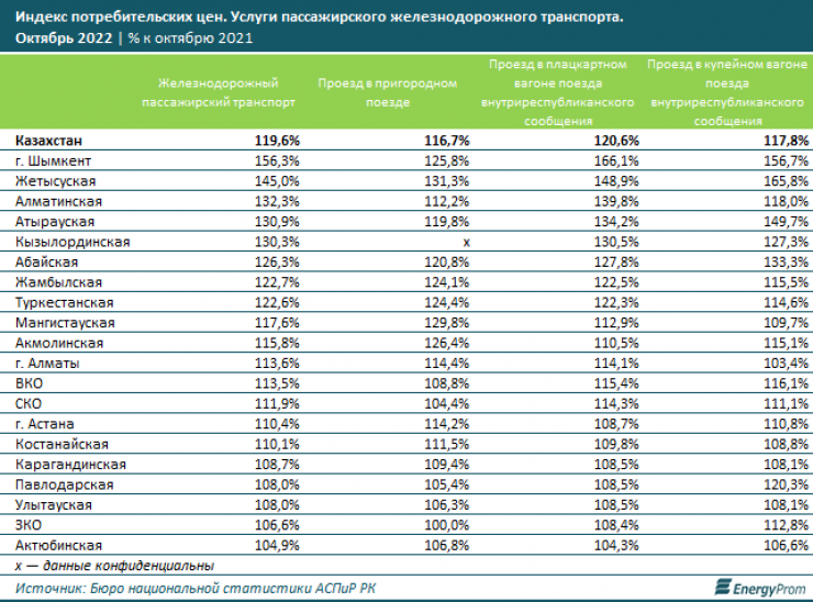 По итогам октября этого года рост цен на услуги пассажирского железнодорожного транспорта составил 19,6 процента за год. Проезд в пригородных поездах стал для казахстанцев дороже на 16,7 процента за год, в плацкартных вагонах - на 20,6 процента, в купейных рост составил 17,8 процента.