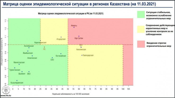 В "красной" зоне по-прежнему располагаются Нур-Султан и Алматы. Они попали сюда 10 марта.