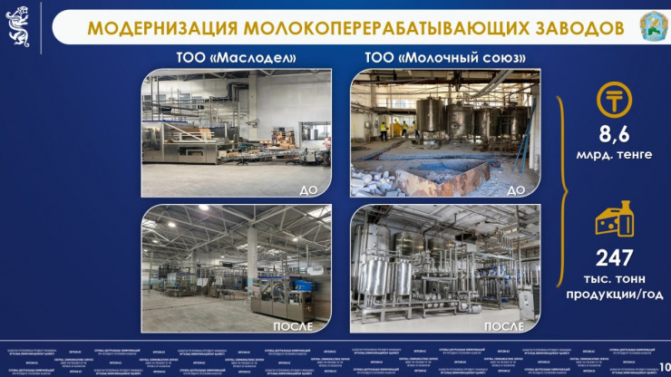 Аким области отметил, что благодаря модернизации на 8,6 миллиарда тенге ТОО "Маслодел" и "Молочный союз" смогут суммарно производить 247 тысяч тонн продукции в год.