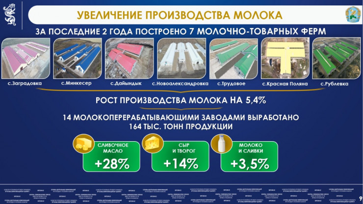 В регионе за последние два года запущены 7 современных молочно-товарных ферм, благодаря которым производство молока выросло на 5,4 процента. В этом году ведется строительство еще 11 ферм, из которых 5 будут запущены в этом месяце.