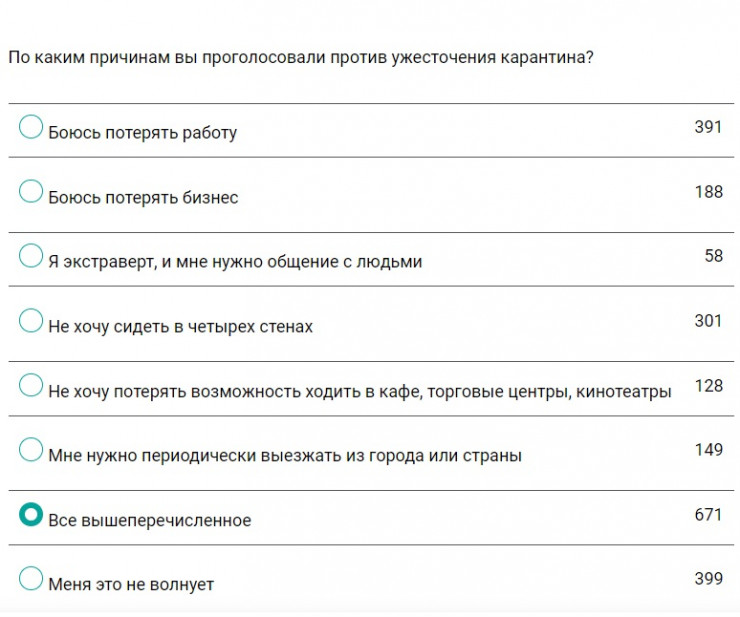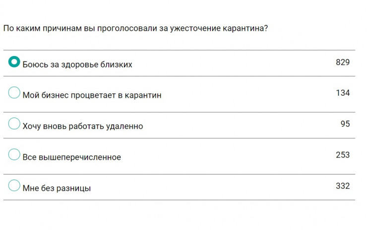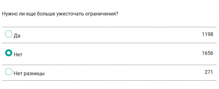 В вопросе о дальнейшем усилении ограничений мнение читателей также разделилось надвое. Чуть больше половины читателей считает, что не нужно ужесточать карантин, вторая половина выбрала варианты ответа "Да" или "Нет разницы". Также читатели поделились своим мнением в комментариях.
