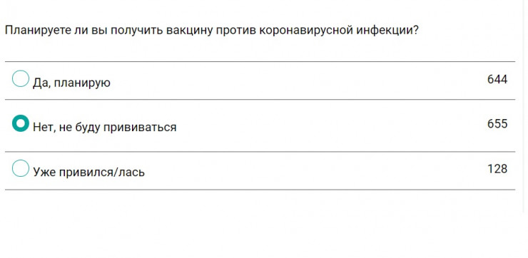 Напоследок участники опроса рассказали, планируют ли получить вакцину против коронавирусной инфекции. 45 процентов опрошенных желают привиться, 46 процентов - нет. 128 человек, или девять процентов ответили, что уже вакцинировались.