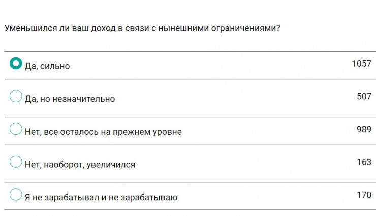 А у 37 процентов участников опроса сильно уменьшился доход в связи с нынешними ограничениями.
