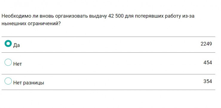 В связи с этим читатели ответили, что необходимо вновь организовать выдачу 42 500 для потерявших работу из-за нынешних ограничений. Этот вариант ответа выбрал 71 процент опрошенных. Только 15 процентов заявили, что помощь от государства в виде пособия не нужна, а остальные выбрали вариант ответа "Нет разницы".