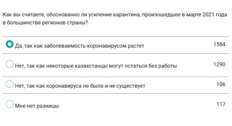 При этом 51 процент участников опроса считает обоснованным усиление карантина. 42 процента выступают против ограничений, так как некоторые казахстанцы могут остаться без работы. Остальные либо не верят в коронавирус, либо безразличны к карантинным мерам.