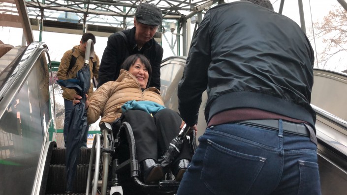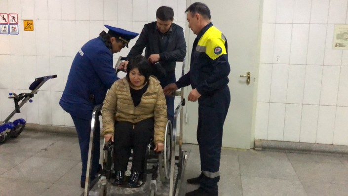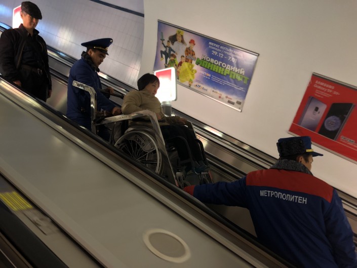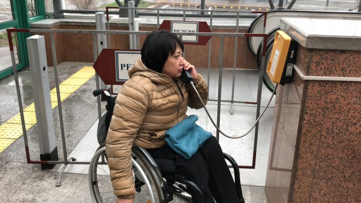 Далее мы отправились на станцию метро "Байконыр". Депутат Ляззат Калтаева подняла трубку, чтобы попросить включить подъемник, но никто не ответил.