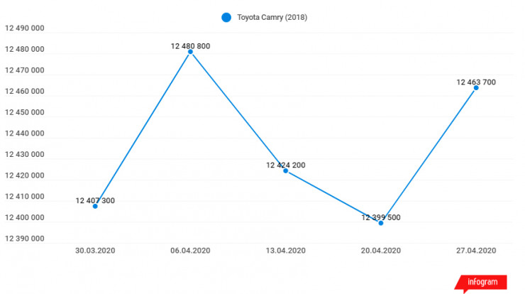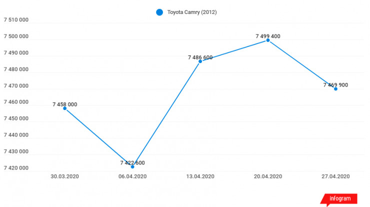 В случае с Toyota Camry 2012 года выпуска за апрель стоимость слегка выросла: с 7 458 000 до 7 469 900 тенге, или на 0,2 процента. Перемены несущественные, однако по состоянию на 20 апреля средний ценник на седан находился на наивысшей отметке за весь период сбора данных - 7 499 400 тенге.