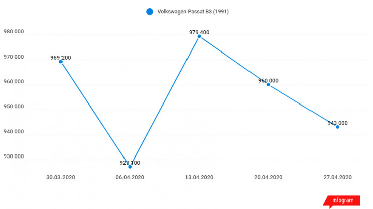 Volkswagen Passat за прошедший месяц, напротив, немного подешевел: с 969 200 до 943 000 тенге. Речь идет об автомобилях 1991 года выпуска. Однако в течение месяца цена модели менялась скачками: то падала сразу на 4,3 процента, то росла почти на 6 процентов.