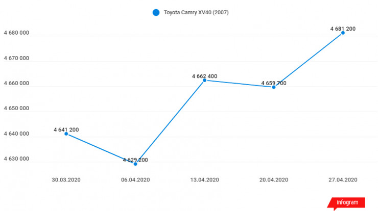 Наиболее популярной Toyota Camry в данной ценовой категории является модель 2007 года выпуска. Средний ценник в начале месяца составлял 4 641 200 тенге. После небольшого падения по итогам первой недели апреля цена "сороковки" поползла вверх. Правда, рост по состоянию на 27 апреля сложно назвать значительным: около 40 тысяч тенге, или 0,9 процента.
