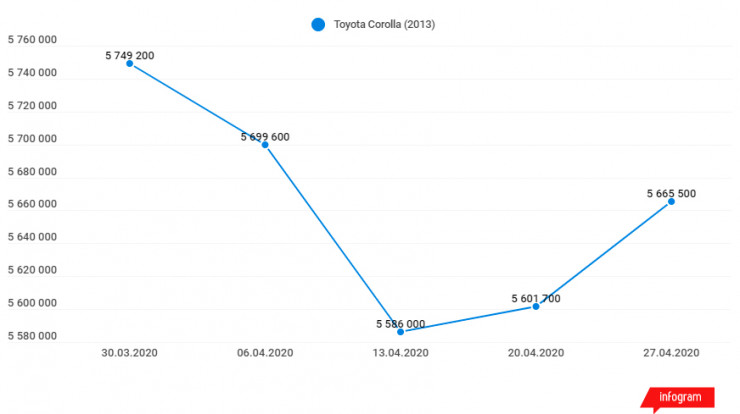 Toyota Corolla c индексом E170 представлена моделью 2013 года выпуска. За апрель автомобиль едва заметно подешевел: с 5 749 200 до 5 665 500 тенге. Падение составило 1,5 процента. По данным экспертов, к концу мая цена вернется к прежнему значению. Об этом свидетельствует один факт: стоимость падала до середины апреля, достигнув отметки 5 586 000 тенге, а затем начала расти.