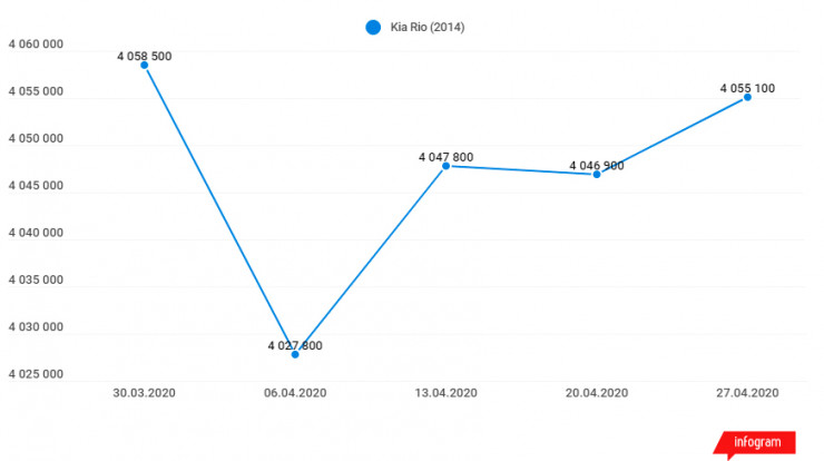 Стоимость Kia Rio за апрель слегка снизилась. Разница едва заметна - 0,1 процента. Однако это не самое низкое значение. Отмечается, что падение цен на седан началось еще во второй половине марта и закончилось в начале апреля на отметке 4 027 800 тенге. С того времени средняя цена "Рио" снова ползет вверх.