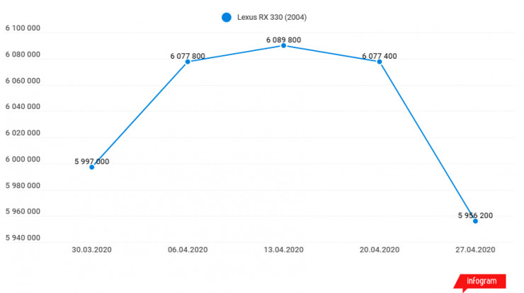 Это единственный кроссовер, рассматриваемый в данной ценовой категории. Так, Lexus RX 330 от 2004 года выпуска за апрель стал чуточку дешевле: 5 956 200 вместо 5 997 000 тенге. Однако в случае этой модели путь, проделанный за месяц, куда интереснее результата. С начала месяца цена активно росла и добралась до 6 089 800 тенге, а потом упала сначала на 0,2 процента, а затем сразу на два процента.