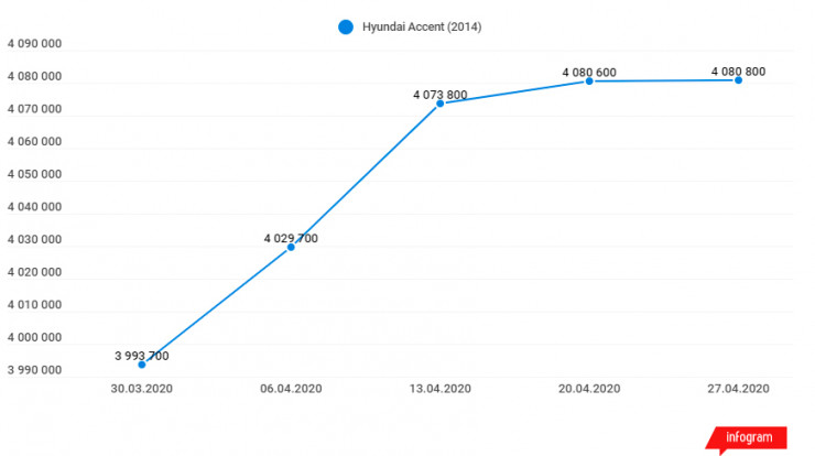 Hyundai Accent 2014 года выпуска в начале апреля в среднем стоил чуть менее четырех миллионов тенге. Отмечается, что с каждым днем цена на этот автомобиль понемногу росла. К 20 апреля она достигла отметки в 4 080 600 тенге и до конца месяца держалась примерно на этом же уровне. В итоге Accent стал дороже на 2,2 процента.