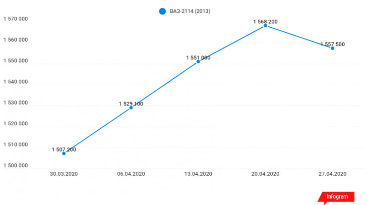 За эту модель российского ВАЗ 2013 года выпуска в начале месяца в среднем просили 1 507 200 тенге. К концу стоимость выросла до 1 557 500 тенге. Таким образом, рост произошел на 3,4 процента. Однако наиболее высоким показатель был ближе к середине апреля - 1 568 200 тенге.