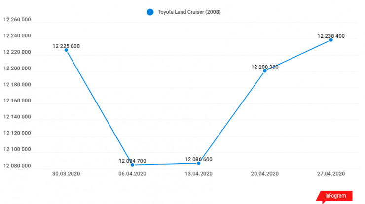 Цена на Toyota Land Cruiser 2008 года выпуска также практически не менялась. В начале месяца средний ценник был на уровне 12 225 800, а к концу опустился до 12 200 300 тенге. Наибольший скачок произошел в первых числах апреля, тогда цена упала сразу на 1,2 процента и спустя неделю стала опять подниматься.