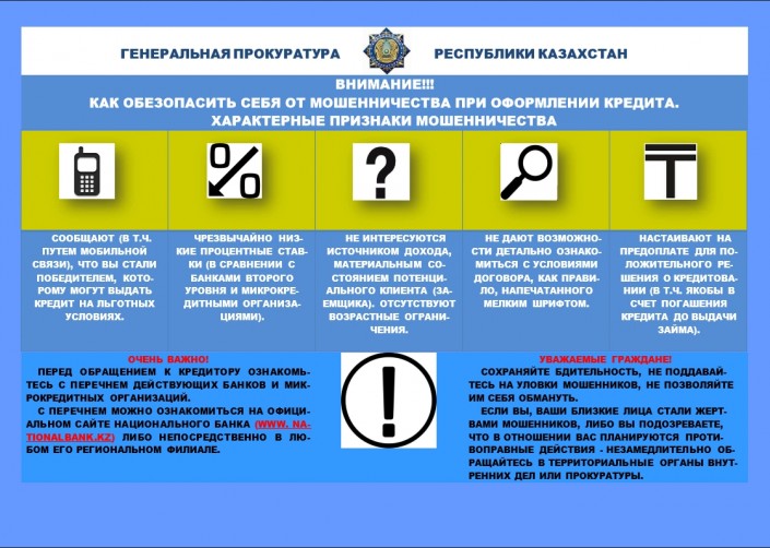 "Подобного рода предложения должны насторожить вас, прежде всего будьте благоразумными. Оградить себя от мошенников предельно просто. С перечнем официально действующих банков второго уровня и микрокредитных организаций, оказывающих услуги по кредитованию, а также принимающих вклады, можно ознакомиться на официальном интернет-ресурсе Национального банка РК (nationalbank.kz)", - говорится в сообщении прокуратуры.