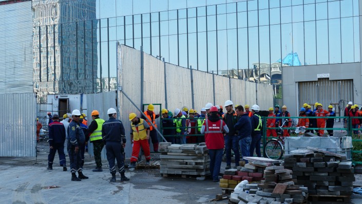 К 11 часам утра к строящемуся объекту съехались пожарные машины. Здесь уже был выстроен отряд спасателей. Служба пожаротушения и аварийно-спасательных работ столичного ДЧС устроила учения. Два года назад у этого объекта можно было увидеть почти такое же скопление пожарных и машин. Но тогда тушили реальный пожар на 25-м этаже. Сегодня условное возгорание ликвидируют на 33-м.