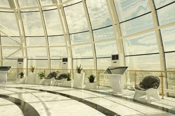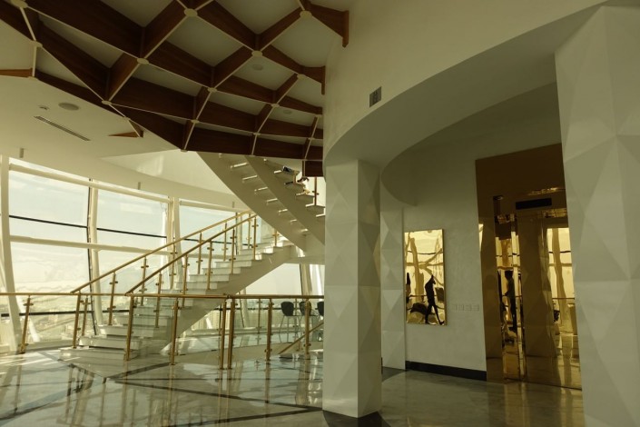 Кроме того, в стволе лифтовой шахты теперь установлены двойные стеклопакеты с энергосбережением, чтобы уменьшить затраты и потери тепла. Здесь, по задумке архитекторов, использовался специальный структурный силиконовый герметик, который работает в широком диапазоне температур, чтобы стекло в дальнейшем не трескалось.