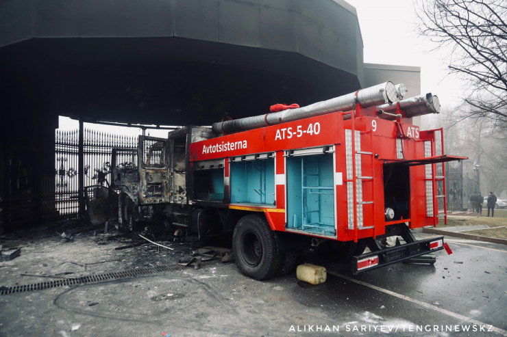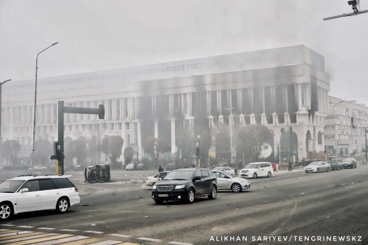 По словам корреспондента, здание городского акимата Алматы 6 января продолжало дымиться и гореть.