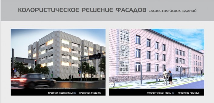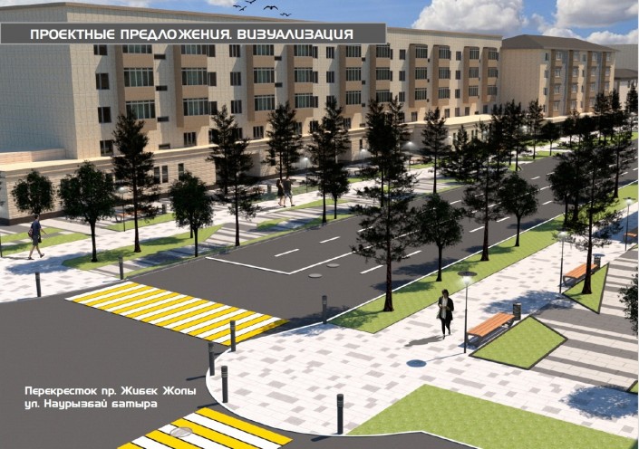 Проект преобразования жилищно-гражданских объектов улицы Жибек жолы (от улицы Желтоксан до проспекта Сейфуллина). Участок - 550 метров. Площадь проектируемой территории - 3,1 гектара. Площадь благоустройства - 1,85 гектара. Площадь озеленения - 0,84 гектара. Планируется высадить 207 деревьев.