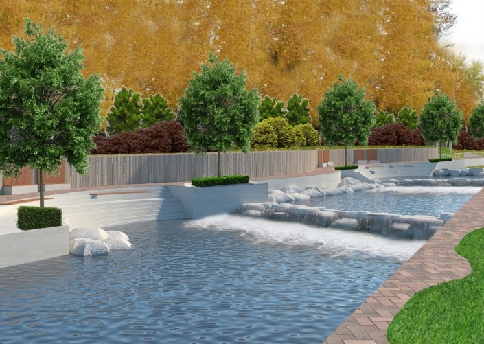 Планируются расширение существующих и устройство новых пешеходных дорожек и аллей на обоих берегах, устройство площадок для отдыха с установкой детских игровых и спортивных комплексов, в том числе инклюзивных. Предусмотрены спуски к воде, на отдельных участках русла реки предлагается заменить бетонные "запруды" на специально подобранные валуны. Запроектирован сухой фонтан. На пешеходных аллеях установят светильники торшерного типа, также встроенная подсветка появится у зеленых насаждений и водной глади.