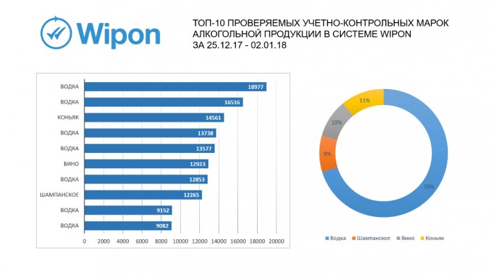 Отмечается, что всего за четвертый квартал 2017 года реализаторами и потребителями алкогольной продукции через систему Wipon проверено более десяти миллионов учетно-контрольных марок (УКМ).