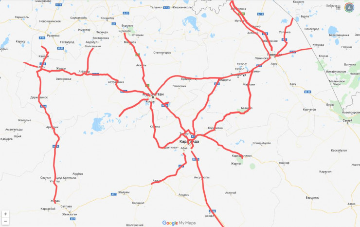 • Нур-Султан - Кабанбай батыр - Нура - Темиртау, километры 16-37, участок от Нур-Султана до поселка Кабанбай батыр;