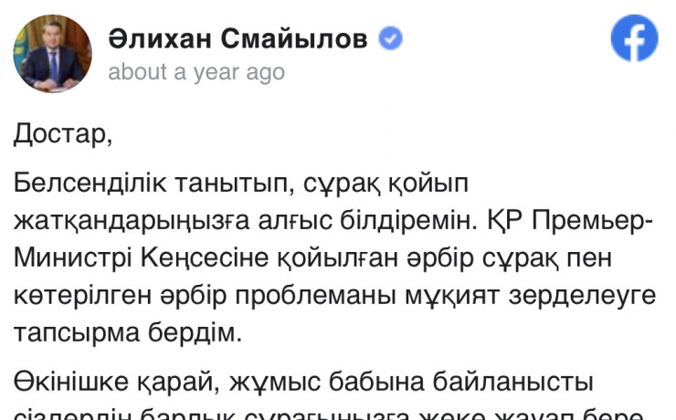 "Друзья, благодарю вас, что вы проявляете активность и задаете вопросы. Я дал поручение канцелярии премьер-министра внимательно изучить каждый поставленный вопрос и каждую поднятую проблему. К сожалению, из-за работы я не могу ответить на все ваши вопросы лично. Хочу донести, что ни один актуальный вопрос не останется без ответа и на него обязательно ответят компетентные органы", - писал Смаилов.