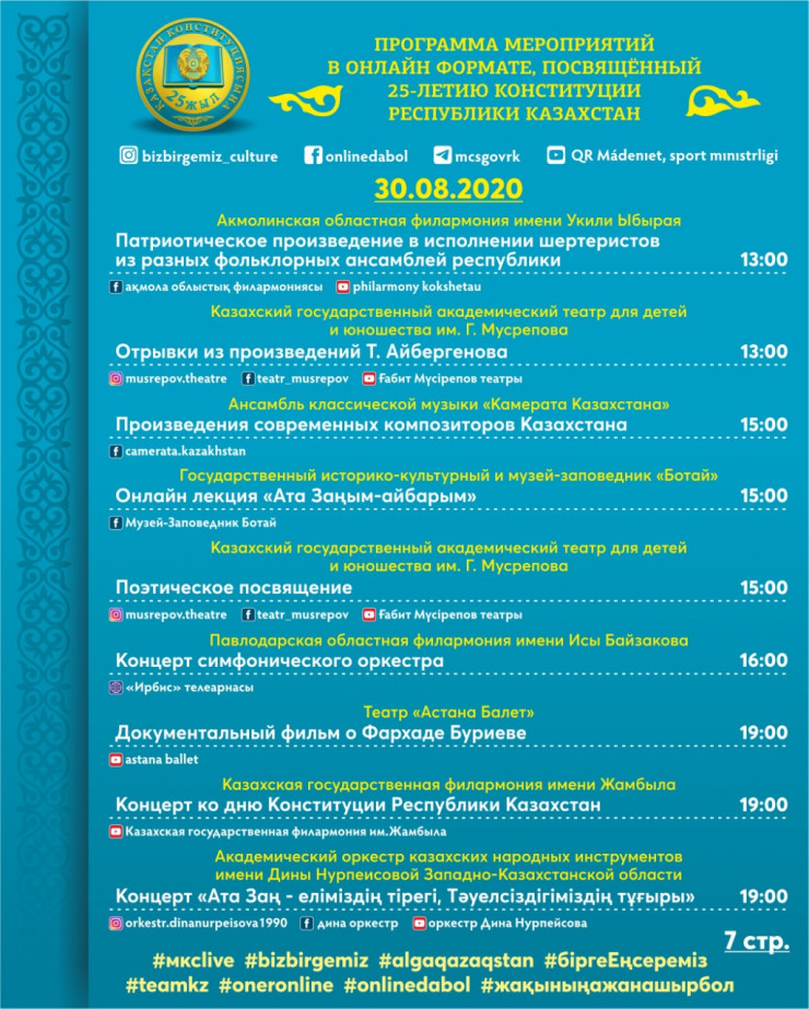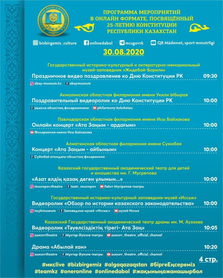 Музеи и библиотеки нашей страны также запланировали ряд мероприятий. Центральный Государственный музей Республики Казахстан и Национальный музей проведут онлайн-экскурсии ко Дню Конституции.