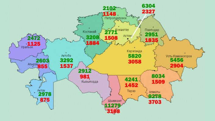 Лидером по количеству заключенных браков является Южно-Казахстанская область - 11 279 актов о заключении брака. Далее в списке фигурирует Алматы - 9 278 актов, Алматинская область - 8 034 зарегистрированных брака. Астана расположилась на четвертом месте списка - 6 034 зарегистрированных брака в этом году.