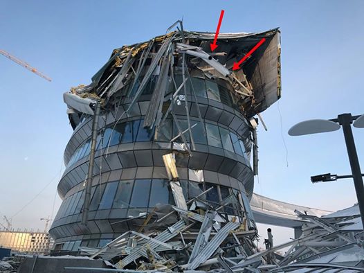 По словам главы BI Group Айдына Рахимбаева, если внимательно рассмотреть фотографии, можно разглядеть, что конструкция обломилась не в месте сварных швов или монтажных креплений, а таким образом, как будто ее срезали.