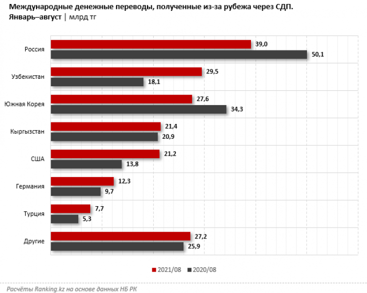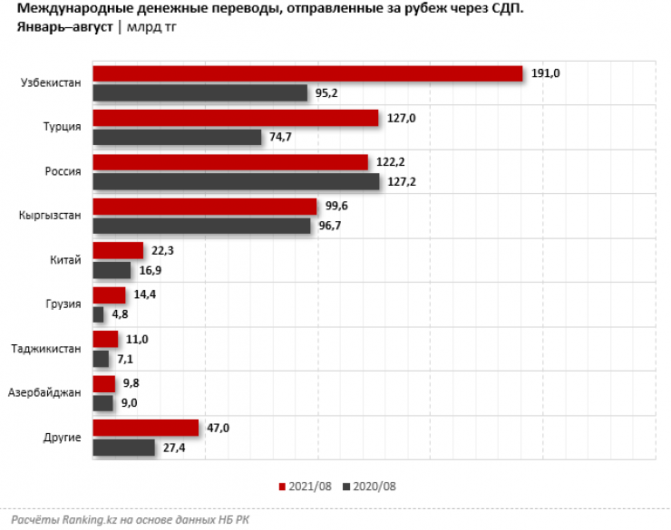 По расчетам аналитиков агентства, сделанным на основе данных Национального банка по системе денежных переводов (СДП), среди стран, в которые чаще всего посылали деньги из Казахстана с начала 2021 года, лидирует Узбекистан. В страну отправили 191 миллиард тенге, что вдвое больше, чем за такой же период прошлого года. Далее в рейтинге идут Турция (127 миллиардов тенге) и Россия (122,2 миллиарда тенге).