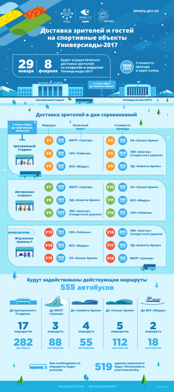 Кроме того, особое внимание будет уделено доставке зрителей и гостей на стадион "Алматы Арена" в дни открытия и закрытия Универсиады, а именно 29 января и 8 февраля соответственно. Стоимость проезда на специальных маршрутах составит 100 тенге в один конец. Автобусы будут отходить с двух точек города - с Центрального стадиона и площади "Астана" (КБТУ).