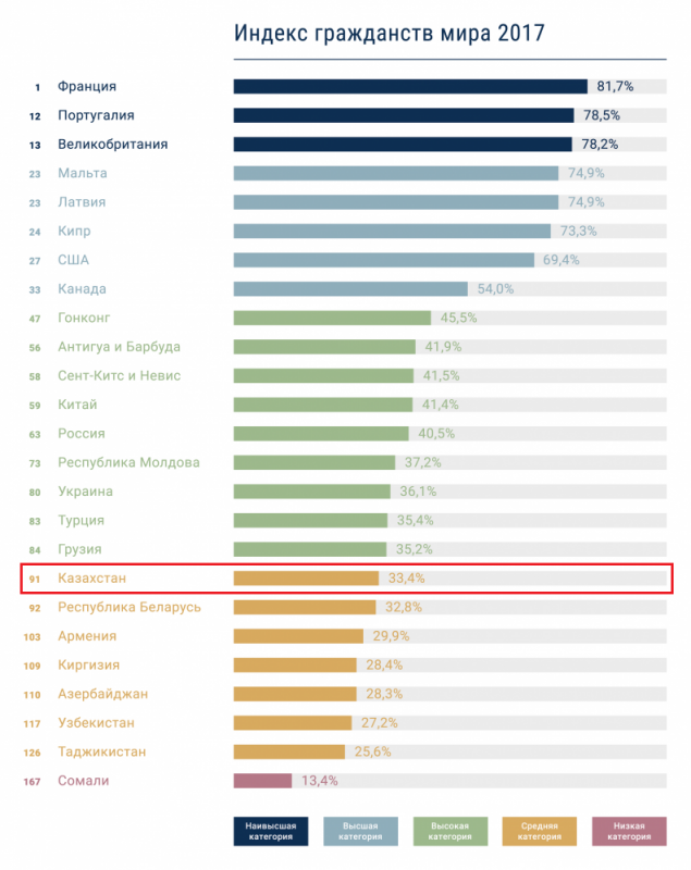 В рейтинге 2017 года казахстанское гражданство получило 33,4 процента, повторив показатель предыдущего года. В общем рейтинге Казахстан занял 91-е место, а в прошлом году был на 85-й строчке. За пять лет показатель казахстанского гражданства в индексе улучшился на 3,3 процента.