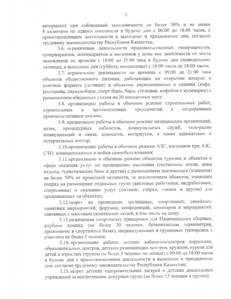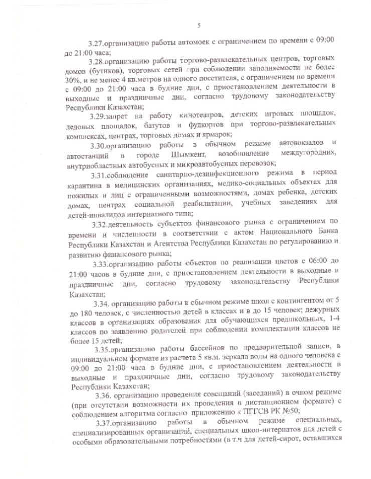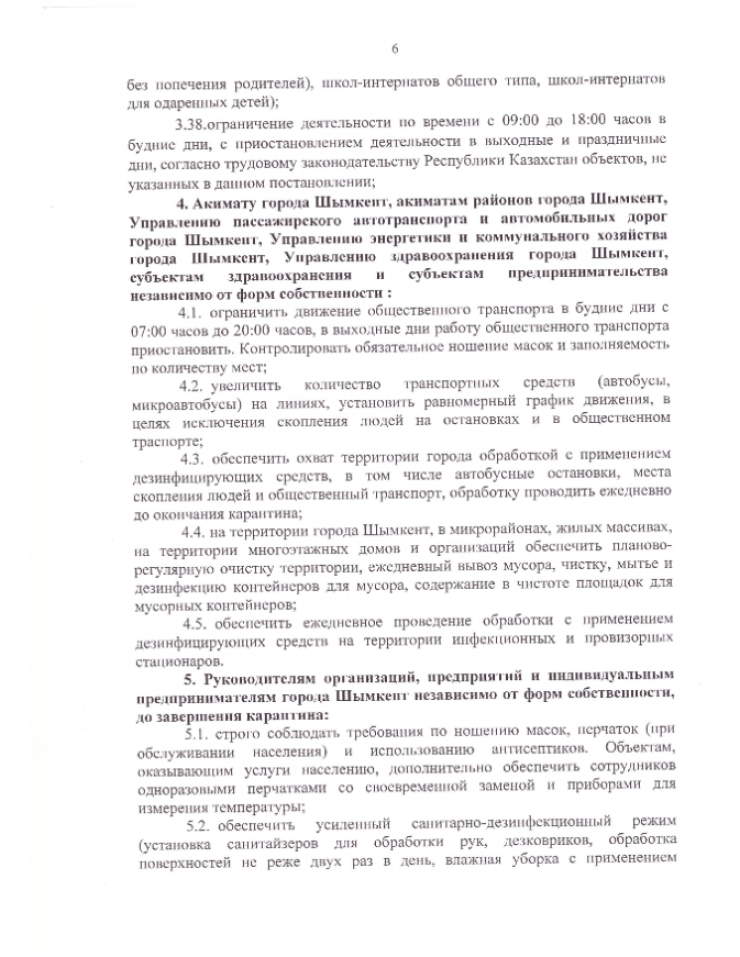 Жителям и гостям Шымкента запрещено проведение мероприятий, связанных с массовым скоплением людей (поминок, тоев, юбилеев и так далее). Лицам старше 65 лет предписано ограничить передвижение по городу. Населению необходимо соблюдать масочный режим и социальную дистанцию в два метра.