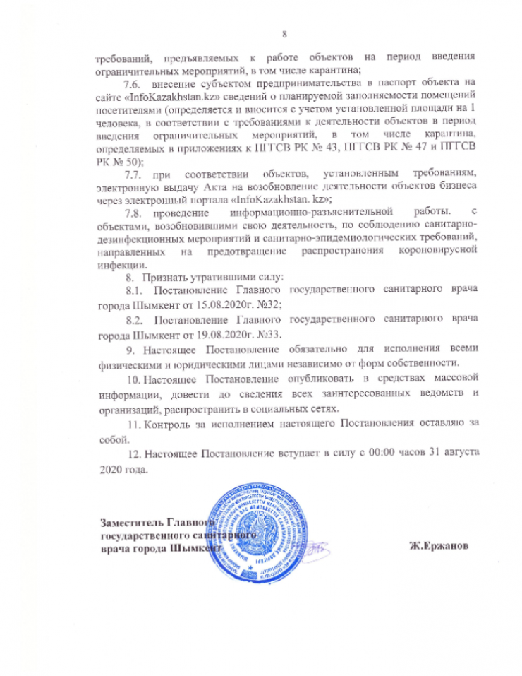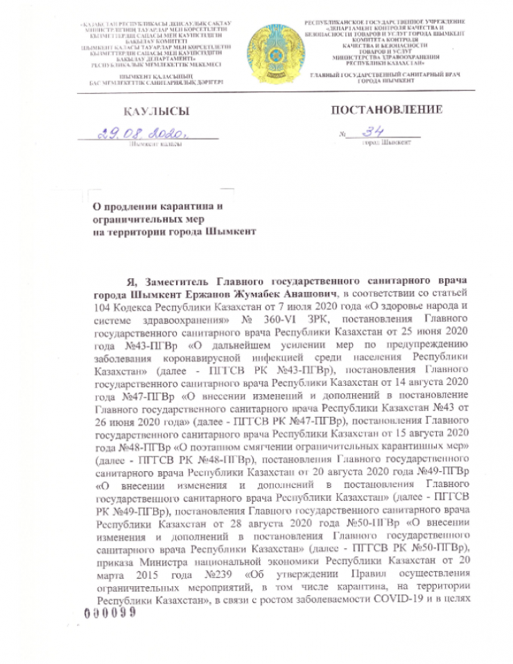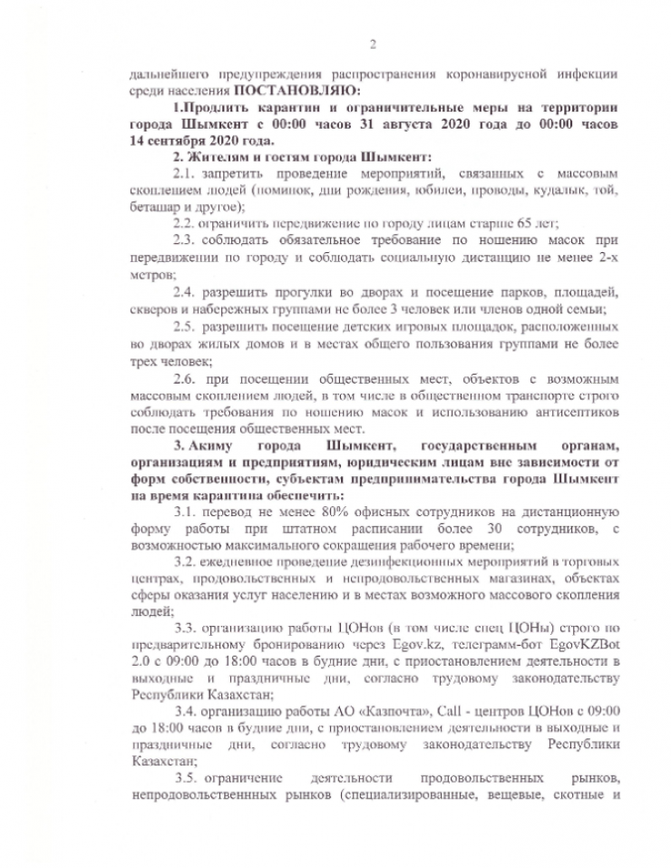 "В связи с ростом заболеваемости COVID-19 и в целях дальнейшего предупреждения распространения коронавирусной инфекции среди населения постановляю: продлить карантин и ограничительные меры на территории города Шымкент с 00.00 часов 31 августа 2020 года до 00.00 часов 14 сентября 2020 года", - говорится в документе.