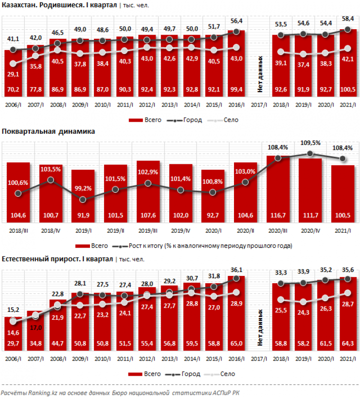 Как сообщается в исследовании Ranking.kz, в первом квартале текущего года в стране родилось 100,5 тысячи детей, это самый высокий показатель соответствующего периода за все последние годы. В сравнении с аналогичным периодом прошлого года прирост численности родившихся составил колоссальные 8,4 процента.