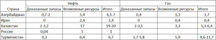 Таблица 1. Ресурсы нефти и газа государств Каспийского региона, миллиардов тонн условного топлива (данные О.И. Егорова и М.Т. Кальменова. Институт экономики Комитета науки МОН РК, Южно-государственный университет имени М.О. Ауэзова).