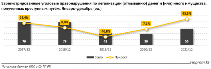 С января по декабрь 2021 года в стране зарегистрировали 56 уголовных правонарушений по легализации (отмыванию) денег и иного имущества, полученных преступным путем - сразу на 43,6 процента больше, чем годом ранее.