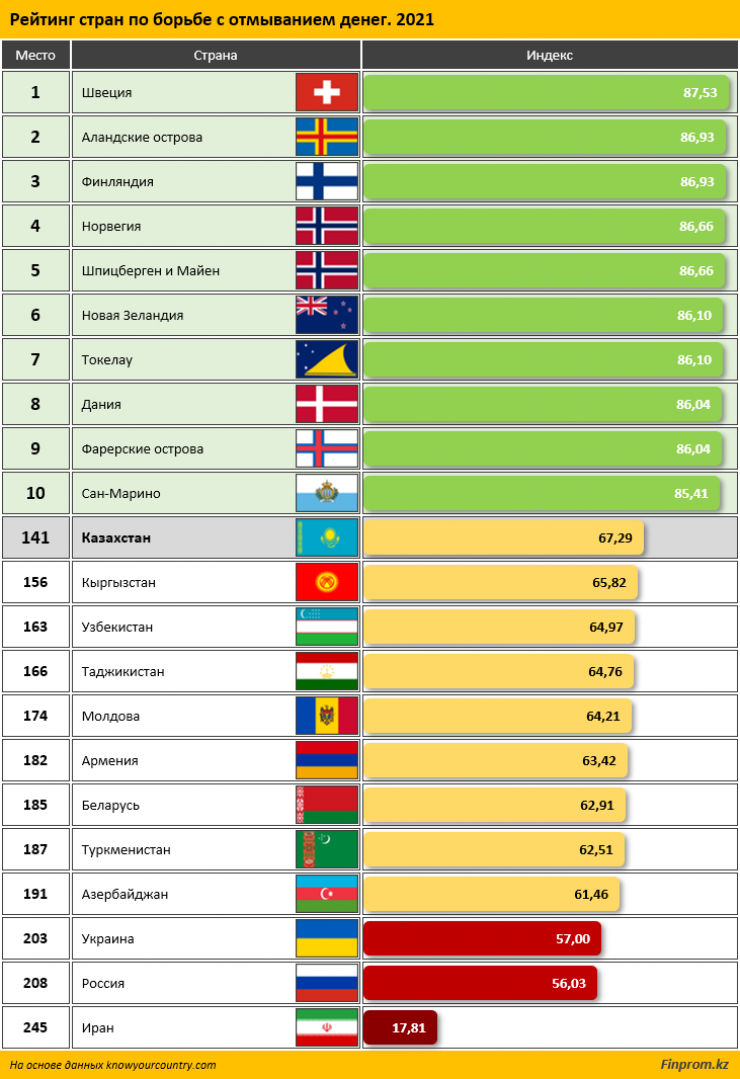 В рейтинге стран по борьбе с отмыванием денег в 2021 году Казахстан занял 141-е место из 245. Индекс страны составил 67,29.