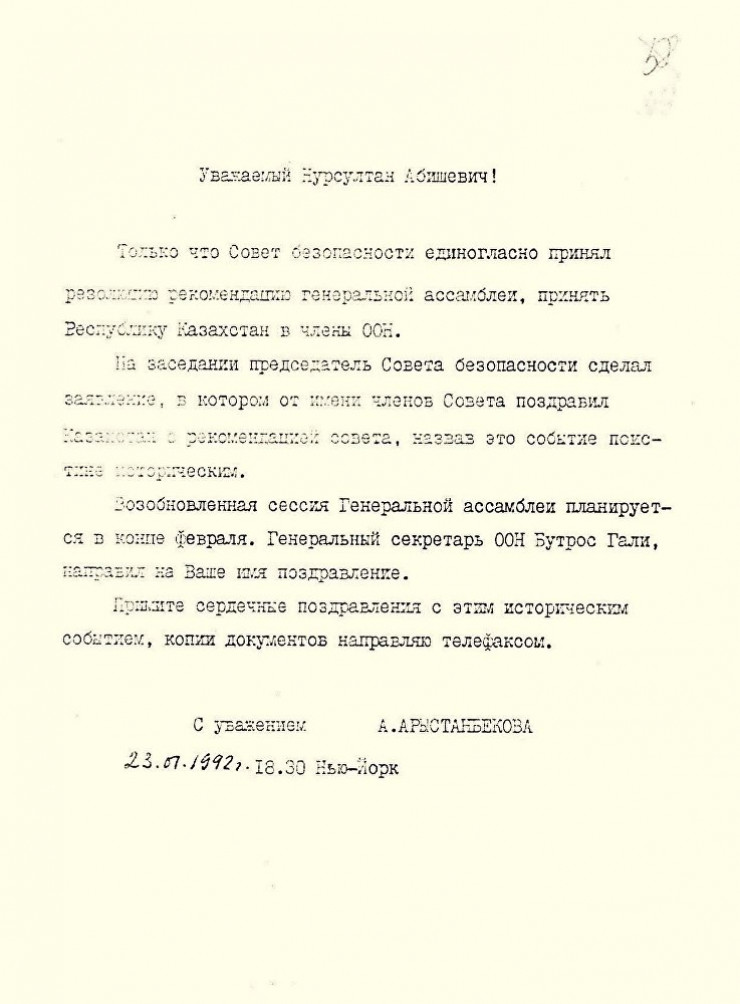 Источник: Facebook AkordaPress / Архивное фото документа о голосовании Совета Безопасности по поводу предстоящего вступления Казахстана в ООН, 1992 год