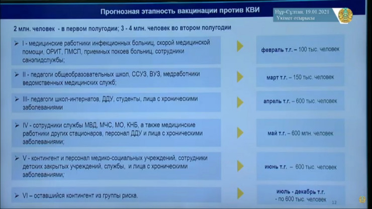 • третий этап: педагоги школ-интернатов, детских дошкольных учреждений, студенты, лица с хроническими заболеваниями - 600 тысяч человек с апреля. И далее поэтапно, таким образом, до конца года планируется вакцинировать до шести миллионов казахстанцев.