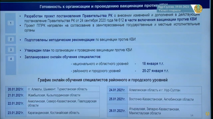 19 января планируется подписание договора между Карагандинским фармацевтическим комплексом и Российском фондом прямых инвестиций на поставку первой партии 20 тысяч доз вакцины "Спутник V". 20 января планируется выдача разрешения на разовый ввоз, направление данных писем в "СК-Фармацию" для проведения закупа по спецпорядку.