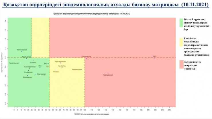Согласно матрице оценки эпидситуации на 10 ноября, в "красной" зоне находятся: Костанайская, Павлодарская, Северо-Казахстанская области.